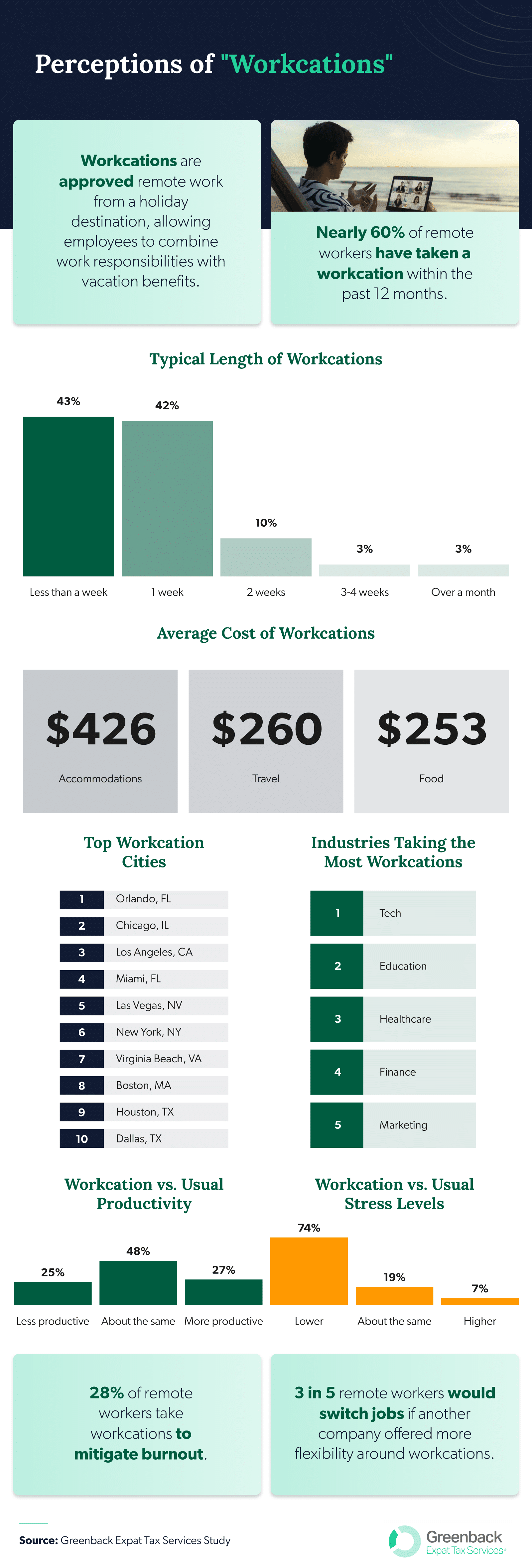 - Nearly 60% of remote workers have taken a workcation within the past 12 months.