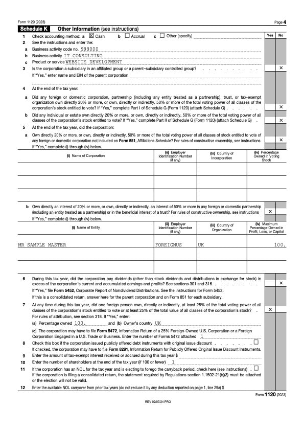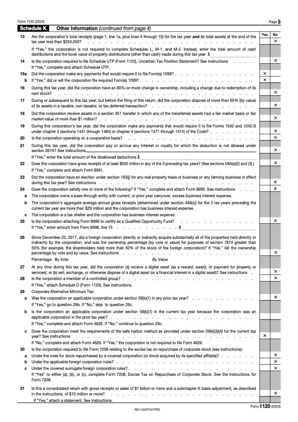 On pages 4 and 5 (Schedule K Other Information), the corporation must answer 26 additional factual questions, including concerning: