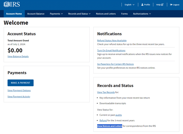 The easiest way to look for a notice is to log into your account and look. Your dashboard will look like this, and at the bottom, you’ll find an option to view notices and letters. Any correspondence the IRS has initiated with you corresponding to your ITIN will appear here.
